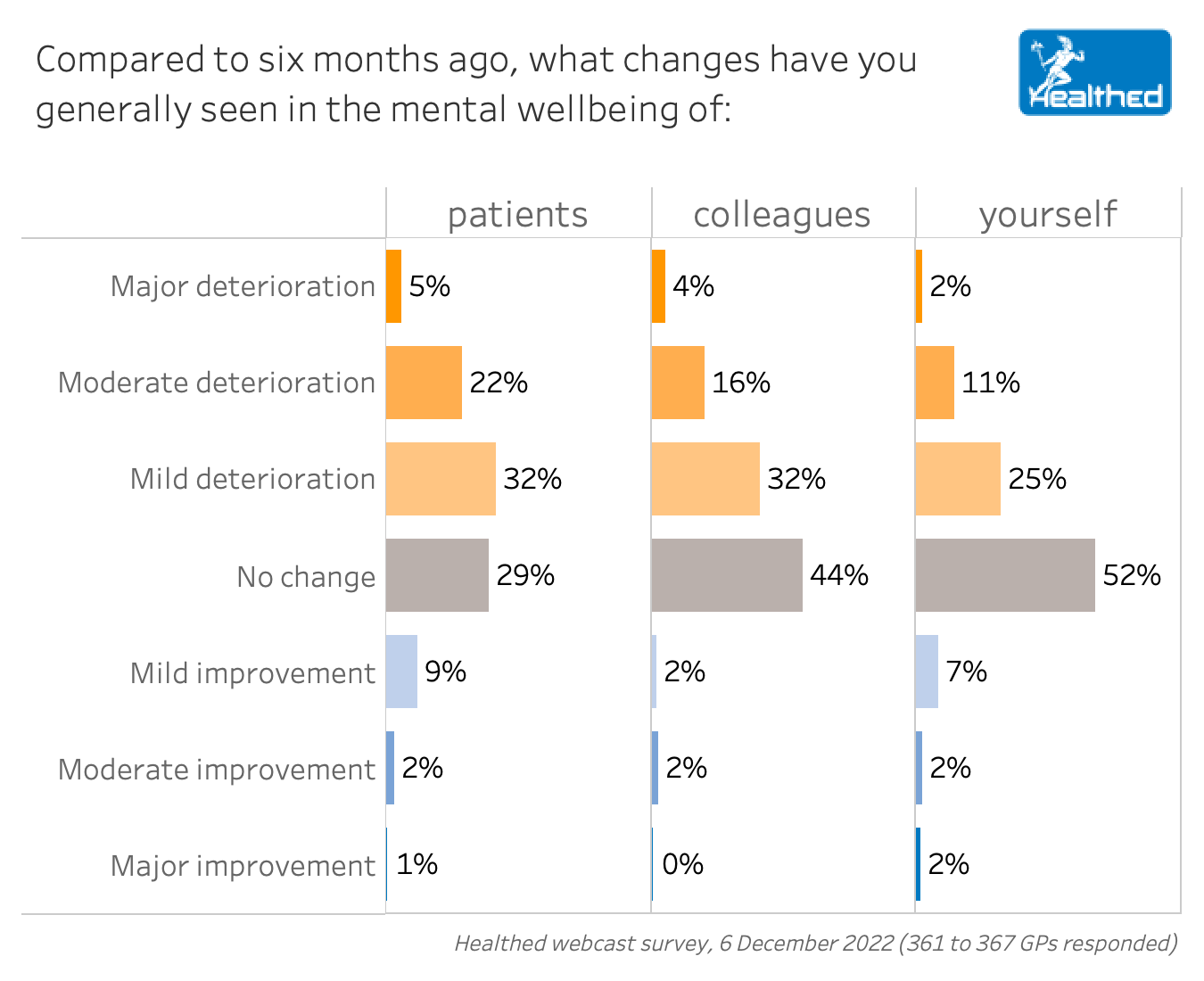 Meanwhile, Healthed’s data shows that 59% of surveyed GPs report at least some deterioration in their patients’ mental health over the past six months, while more than half noted a decline in their colleagues’ mental wellbeing (52% of GPs). Interestingly, fewer GPs said their own mental health was deteriorating (38%).