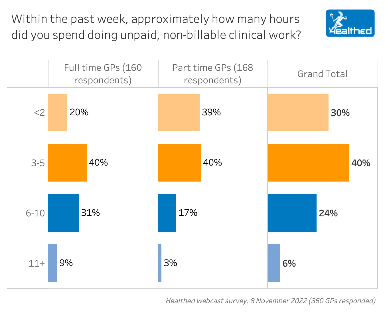 To find out what this looks like in practice, Healthed recently asked over 300 GPs how much time they spent on unpaid work in the past week, and what unpaid activities were taking up the most time.