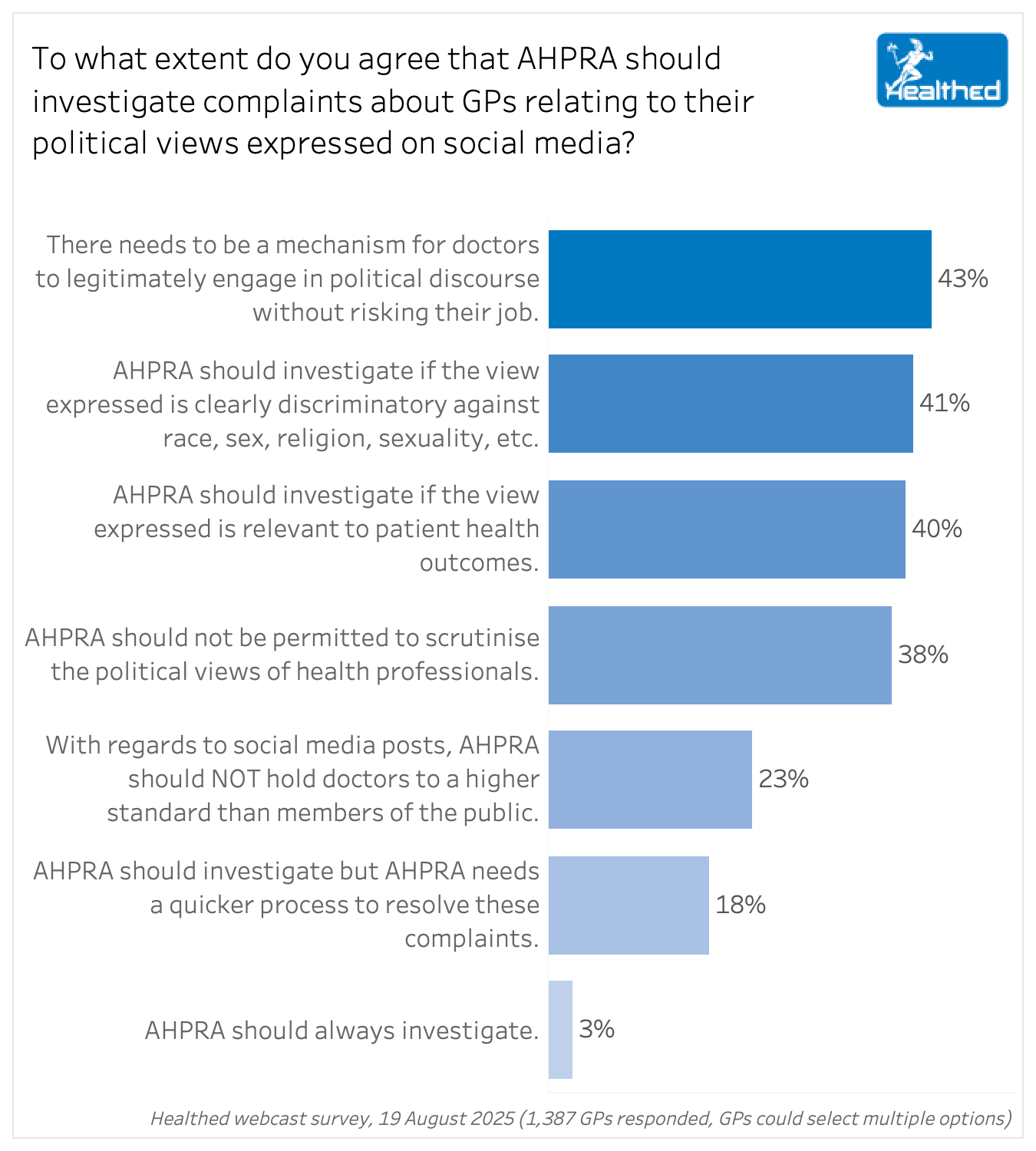 Forty three percent of GPs say doctors should be able to legitimately engage in political discourse without risking their job, and 38% feel that AHPRA should not be permitted to scrutinise the political views of health professionals, a Healthed survey of 1400 GPs found.